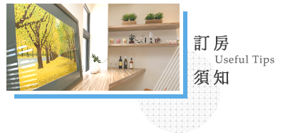 延期住宿:請於住宿前一週告知,將可辦理退費或保留訂金三個月,並於期限內擇期住宿。 |