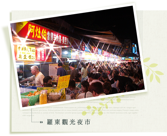 | 極具人情味的羅東觀光夜市有許多傳統美食小吃,從日頭西晒開始,燈便通夜亮麗明晃,熙來攘往的人群,自四面八方攢聚而來,展開熱鬧的一夜。羅東夜市在2010年交通部觀光局舉辦的夜市選拔,獲選成為最友善夜市(與基隆廟口夜市並列)。而在每年暑假都會舉行的羅東藝穗節,是結合在地藝術和文創產業所衍伸出的藝術嘉年華,若您在夏季來到羅東可不要錯過囉~ |